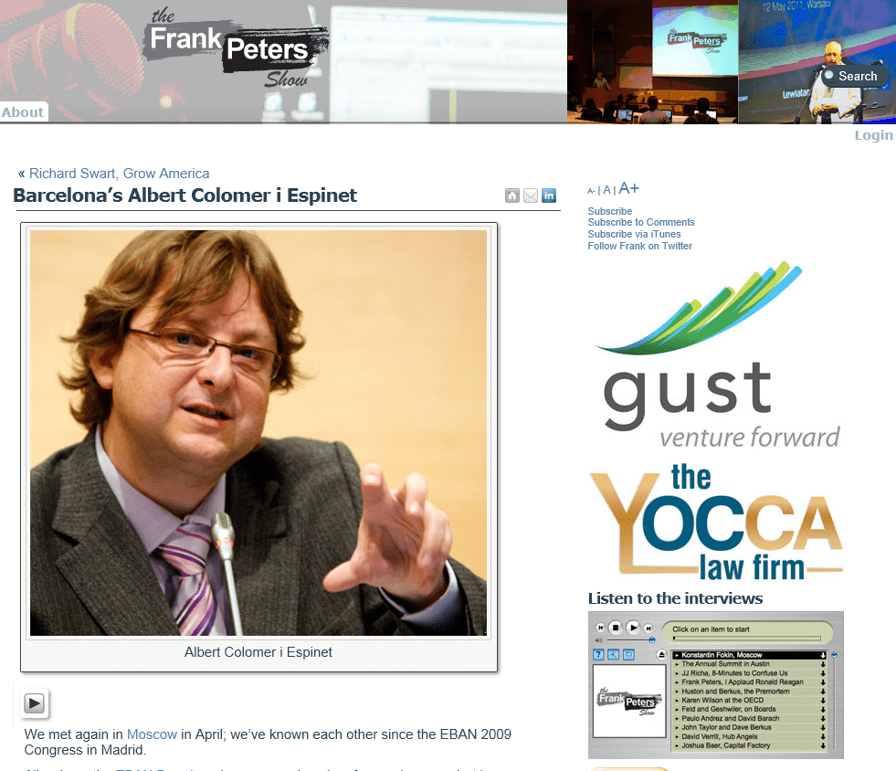 Albert’s on the EBAN Board, and as you can imagine, for good reason, but I never knew the story about the man. I do now as we spend a half hour together discussing entrepreneurship, early-stage investing and business-cultural issues of angel investing in Spain. Albert has some interesting thoughts on the recent EBAN Congress in Russia; he’s faced many similar challenges as he works to promote entrepreneurship at home.”